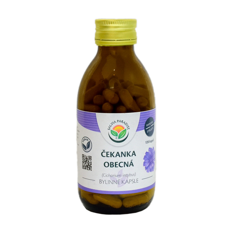 Kapsułki ziołowe wykonane z drobno zmielonego korzenia cykorii. Cykoria pospolita to bylina osiągająca wysokość do 120 cm. Dzięki pięknym fioletowym kwiatostanom można ją również zobaczyć w ogrodach ozdobnych. Część kolekcjonowania to cała roślina – korzeń, łodyga i kwiat. Korzeń zbiera się jesienią.