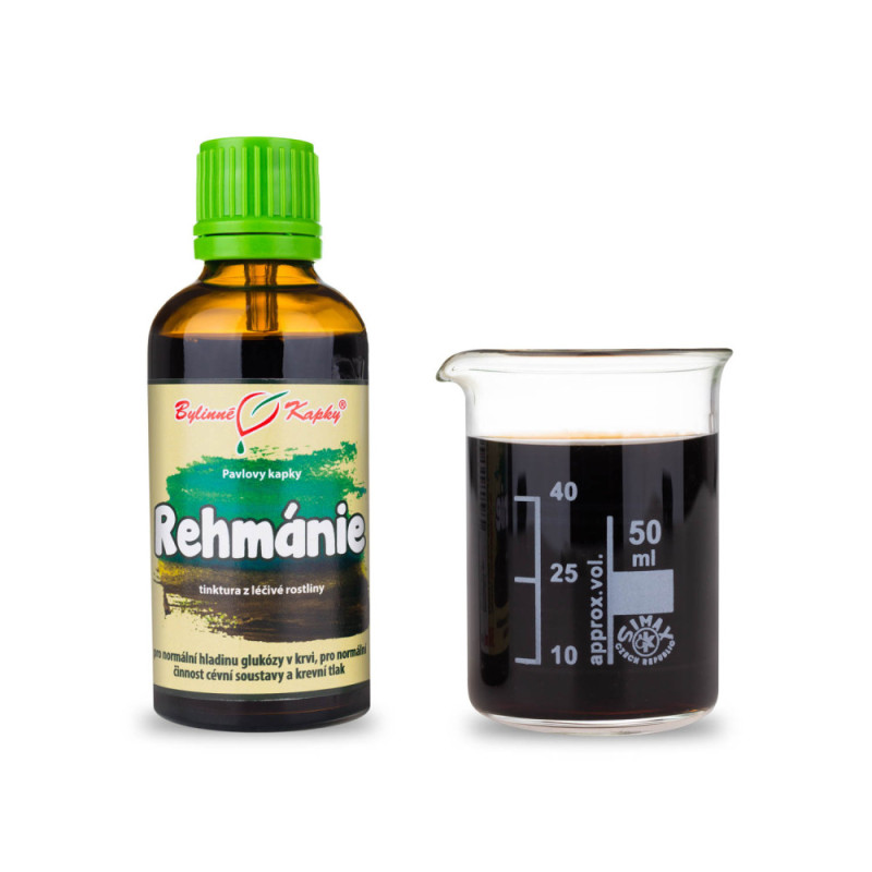 Rehmania (nalewka ziołowa - krople ziołowe Paula). Naturalny ziołowy ekstrakt całościowy (kompleksowy) z korzenia rośliny leczniczej Rehmania lepki dla prawidłowych wartości ciśnienia krwi i dla prawidłowego poziomu glukozy we krwi. Lepka rehmania (Rehmannia glutinosa). Tinctura Rehmanniae radix. Nalewka korzeń Rehmannia.