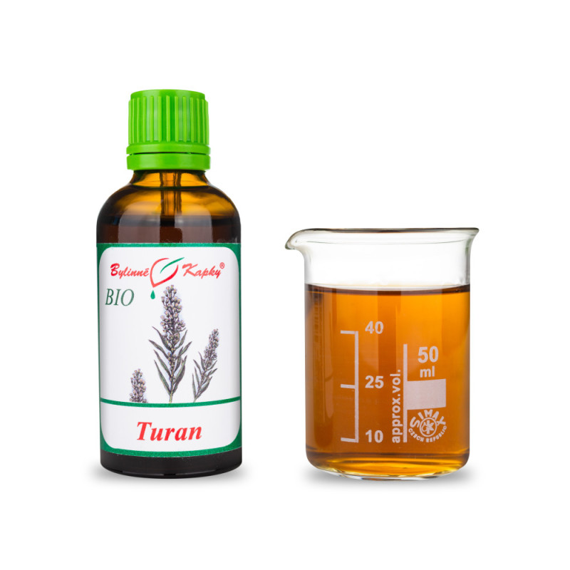 Turanec BIO (nalewka ziołowa - krople ziołowe - nalewki BIO). Naturalny ziołowy ekstrakt całościowy (kompleksowy) z łodygi rośliny leczniczej kanadyjskiego turanu (turanka) do eliminacji wody i kwasu moczowego z organizmu. Conyza canadensis. Kod organizacji kontrolnej: CZ-BIO-002. Tinctura Conyzae herba. Nalewka z kanadyjskiego ziela pcheł.