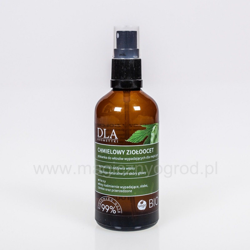 Ocet ziołowy chmielowy to płukanka do włosów osłabionych, wypadających i cienkich przeznaczona dla mężczyzn. Składa się z ekstraktu z szyszek chmielu na bazie octu jabłkowego oraz kompozycji naturalnych olejków eterycznych, które niwelują zapach octu i zapobiegają jego zaleganiu na włosach.