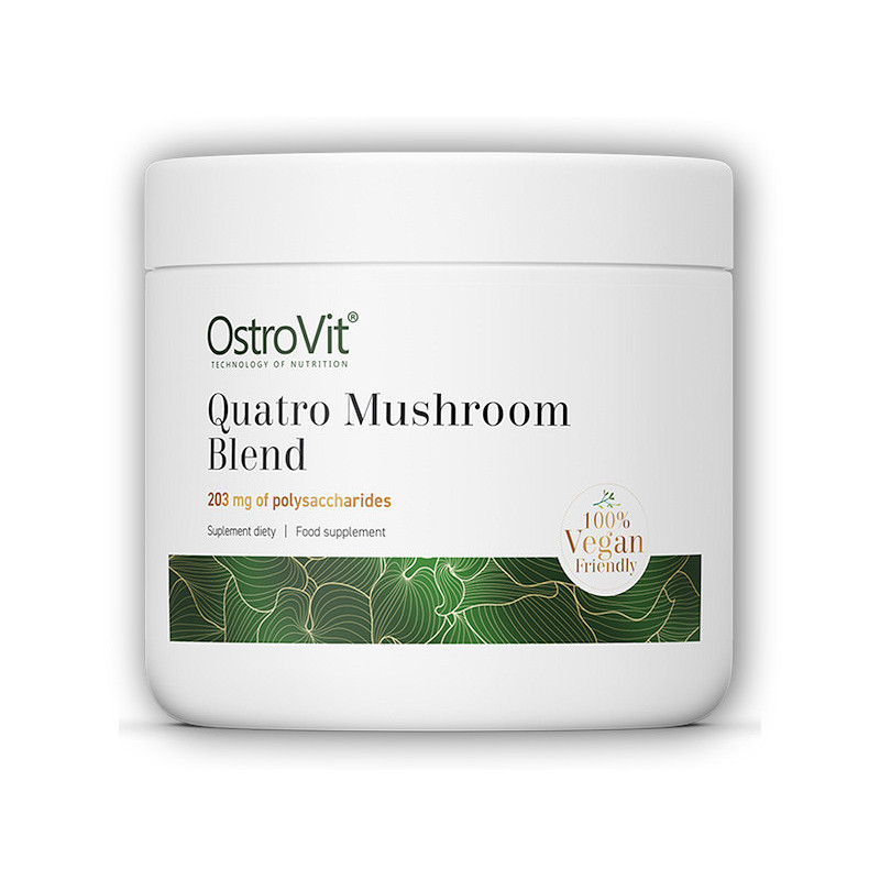 Składniki: ekstrakt z grzybów Reishi (Ganoderma lucidum (Curtis) P. Karst.) standaryzowany na 40% polisacharydów, ekstrakt z soplówki jeżowatej (Hericium erinaceus (BulI.: Fr.) Pers) standaryzowany na 30% polisacharydów, ekstrakt z grzybów Cordyceps (Cordyceps sinensis (Cordyceps sinensis Berk) Sacc.) standaryzowany na 40% polisacharydów, ekstrakt z grzybów Chaga (Inonotus obliquus) standaryzowany na 40% polisacharydów.