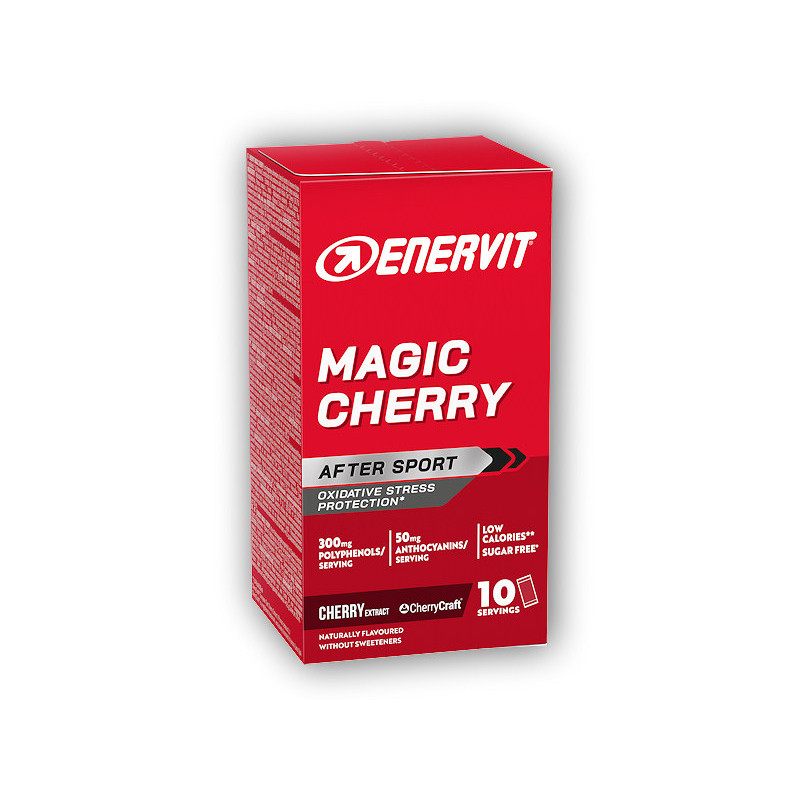 Enervit Magic Cherry to specjalny ekstrakt z wiśni, który zawiera dużą ilość (300 mg na dawkę) polifenoli i witaminy E o wysokiej mocy przeciwutleniającej. Substancje te odgrywają ważną rolę we wspieraniu obrony organizmu przed stresem oksydacyjnym oraz działają przeciwko wolnym rodnikom powstającym podczas intensywnego wysiłku fizycznego. To znacząco wspomaga pełną i skuteczną regenerację po intensywnym wysiłku wytrzymałościowym.